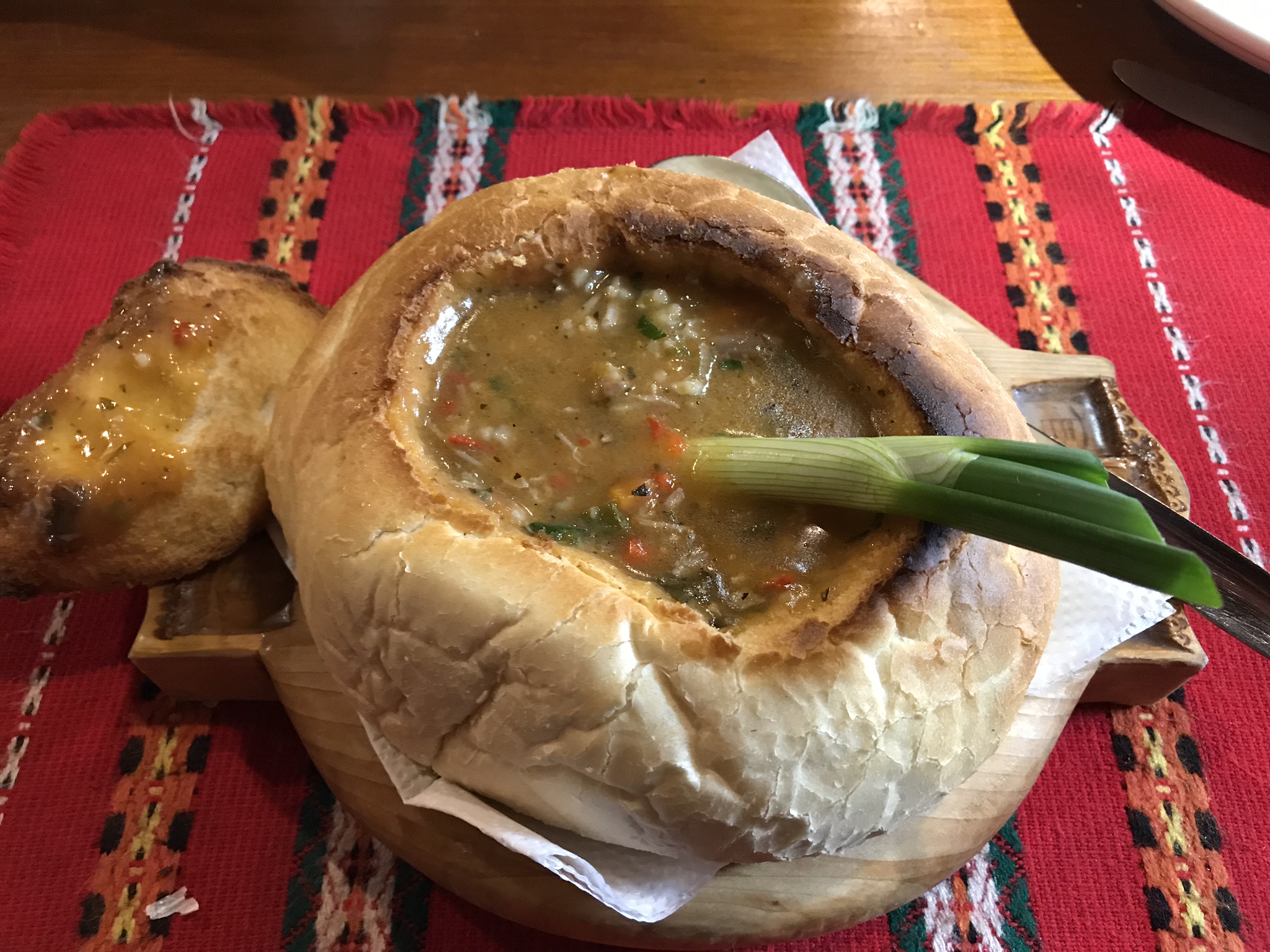 В кафе я заказала куриную грудку и салат. Куриная грудка оказалась очень вкусной, фаршированной базиликовой пастой и сыром. На следующий день в кафе попросила супа. Принесли суп в хлебе с бараниной. Вкусный хлеб с хрустящей корочкой, много баранины.