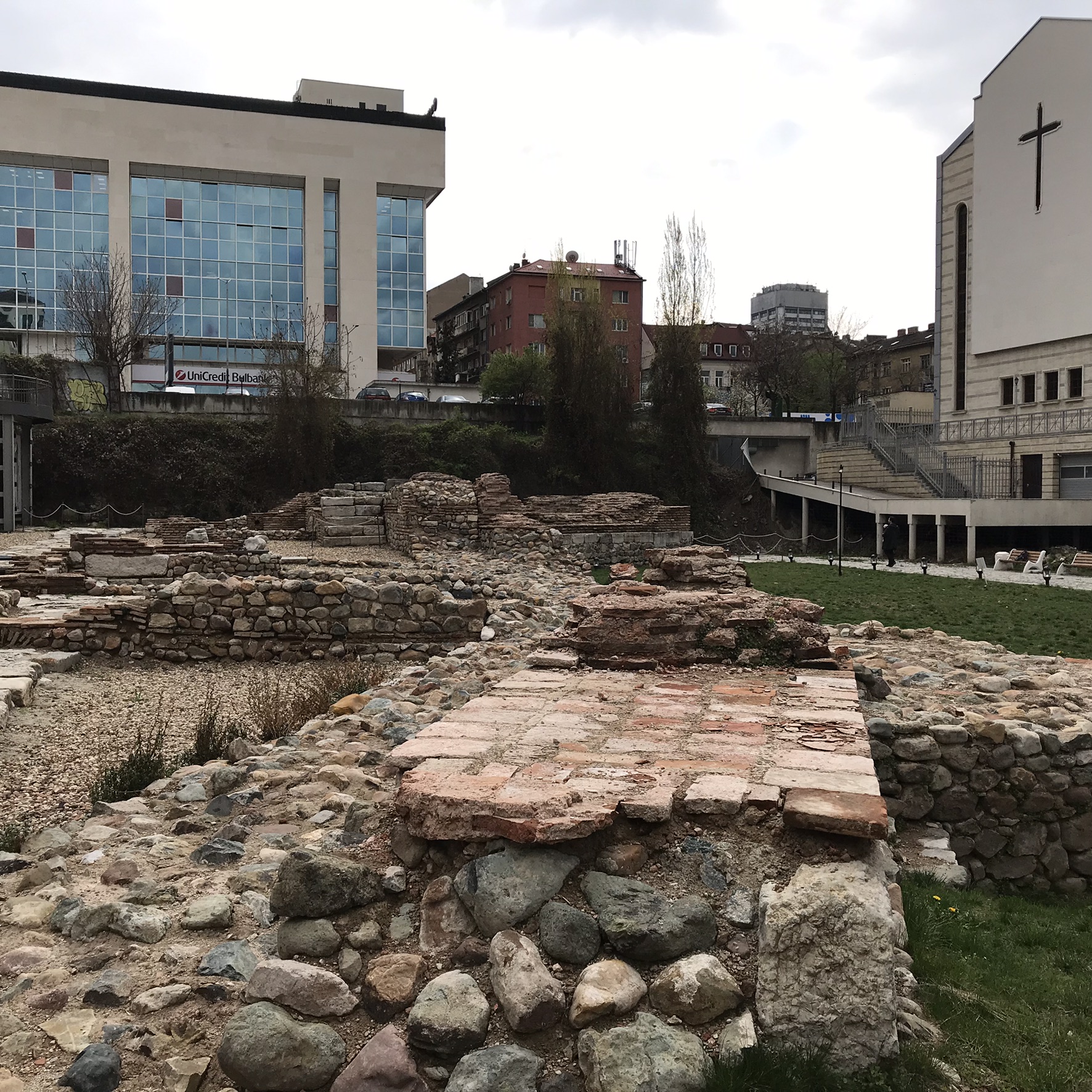Метро начали строить в 90х годах и во время строительства обнаружили большой город римской эпохи. Сердика, так раньше назывался город.. Наверху над метро сделаны открытые площадки с тем, что осталось от древней Сердики. Чтобы не разрушать старинные фундаменты над ними на сваях построены современные здания.